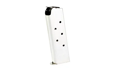 Stainless steel 7-round magazine for 1911 .45 ACP pistols with full-length grip. Pre-drilled for base pad installation.