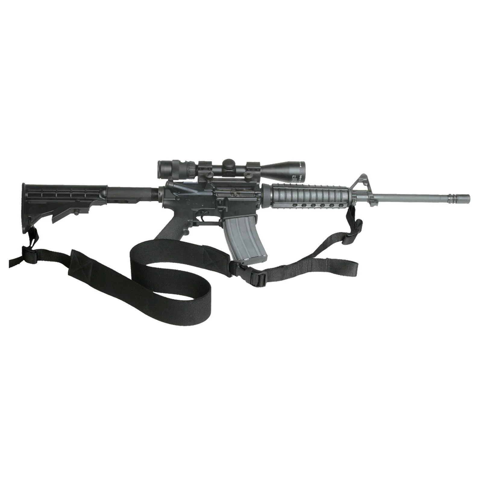 Allows the shooter to adjust the overall length of the sling for a rapid transitions from strong side to support side and back. Designed for muzzle down carry. Place the sling diagonally over your shoulder and under the opposite arm access the free running end of the sling under your arm and easily switch to your opposite shoulder without having the sling tighten on your body. Quickly adjusts to several different shooting and carry positions. 800 pound laboratory certified tensile strength US military application two-inch wide razor-thin elastic material eliminates neck pinch and disperses the firearm weight; thereby reducing fatigue Excellent for all tactical weapons.